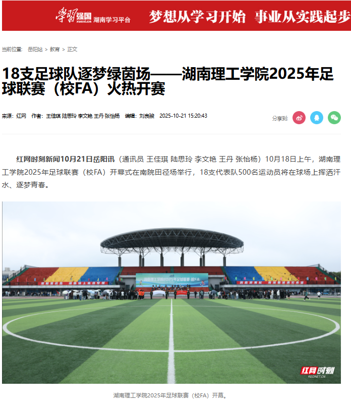 红网时刻新闻10月21日岳阳讯(通讯员 王佳琪 陆思玲 李文艳 王丹 张怡杨)10月18日上午,湖南理工学院2025年足球联赛(校FA)开幕式在南院田径场举行,18支代表队500名运动员将在球场上挥洒汗水、逐梦青春。