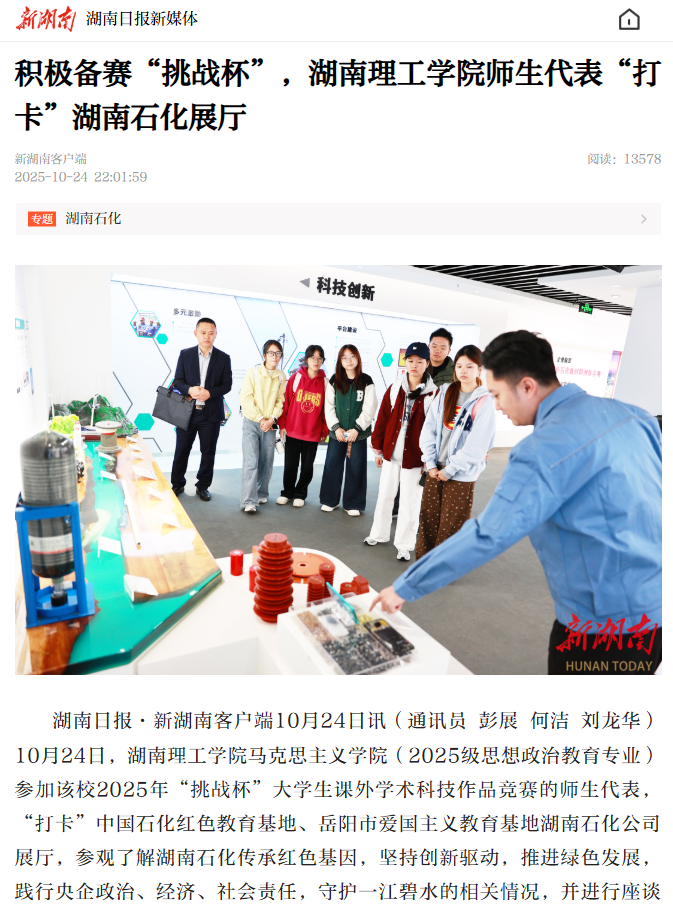湖南日报·新湖南客户端10月24日讯(通讯员 彭展 何洁 刘龙华)10月24日,湖南理工学院马克思主义学院(2025级思想政治教育专业)参加该校2025年“挑战杯”大学生课外学术科技作品竞赛的师生代表,“打卡”中国石化红色教育基地、岳阳市爱国主义教育基地湖南石化公司展厅,参观了解湖南石化传承红色基因,坚持创新驱动,推进绿色发展,践行央企政治、经济、社会责任,守护一江碧水的相关情况,并进行座谈交流,为完成哲学社会科学类社会调查报告参赛作品做准备。