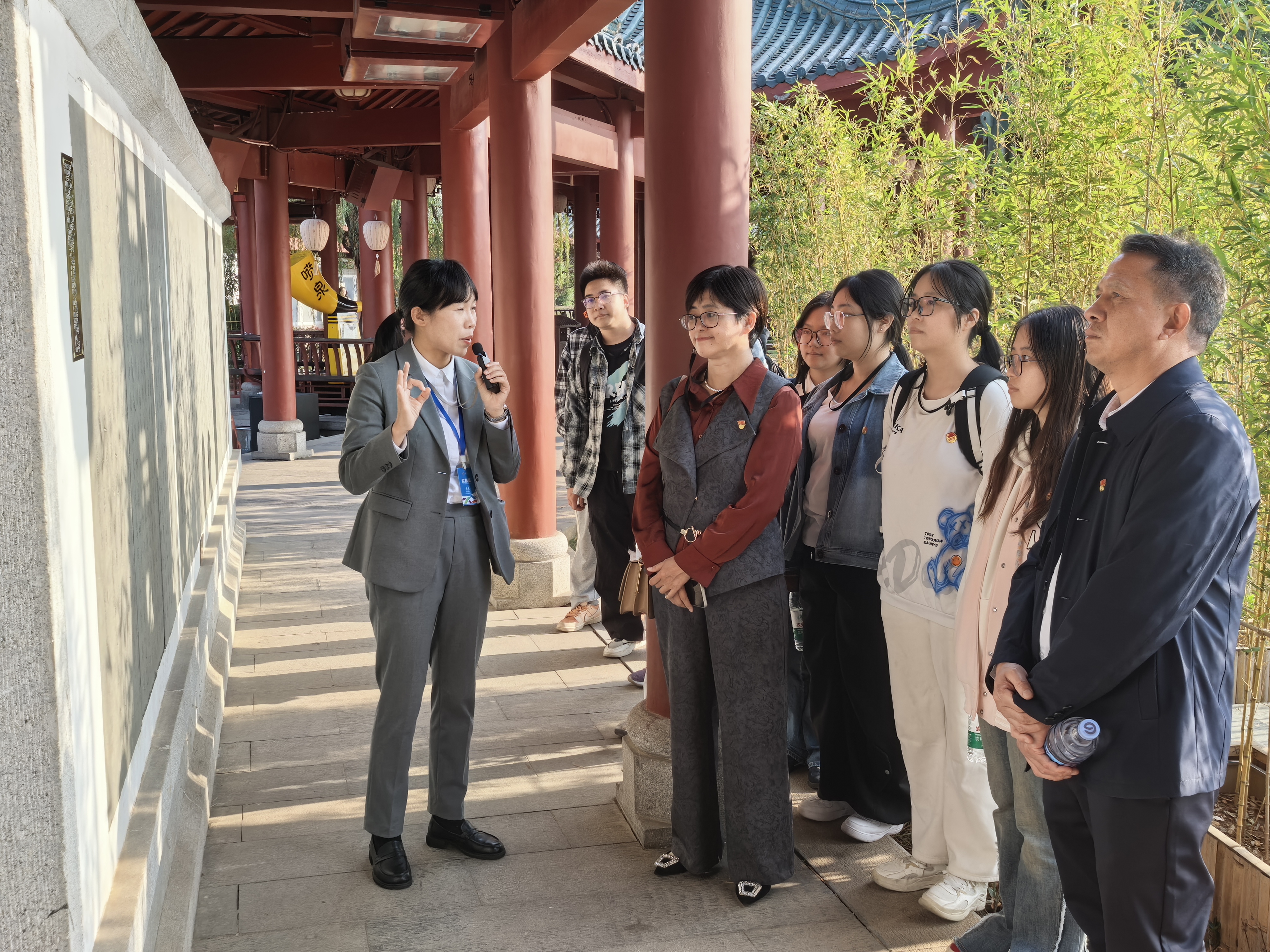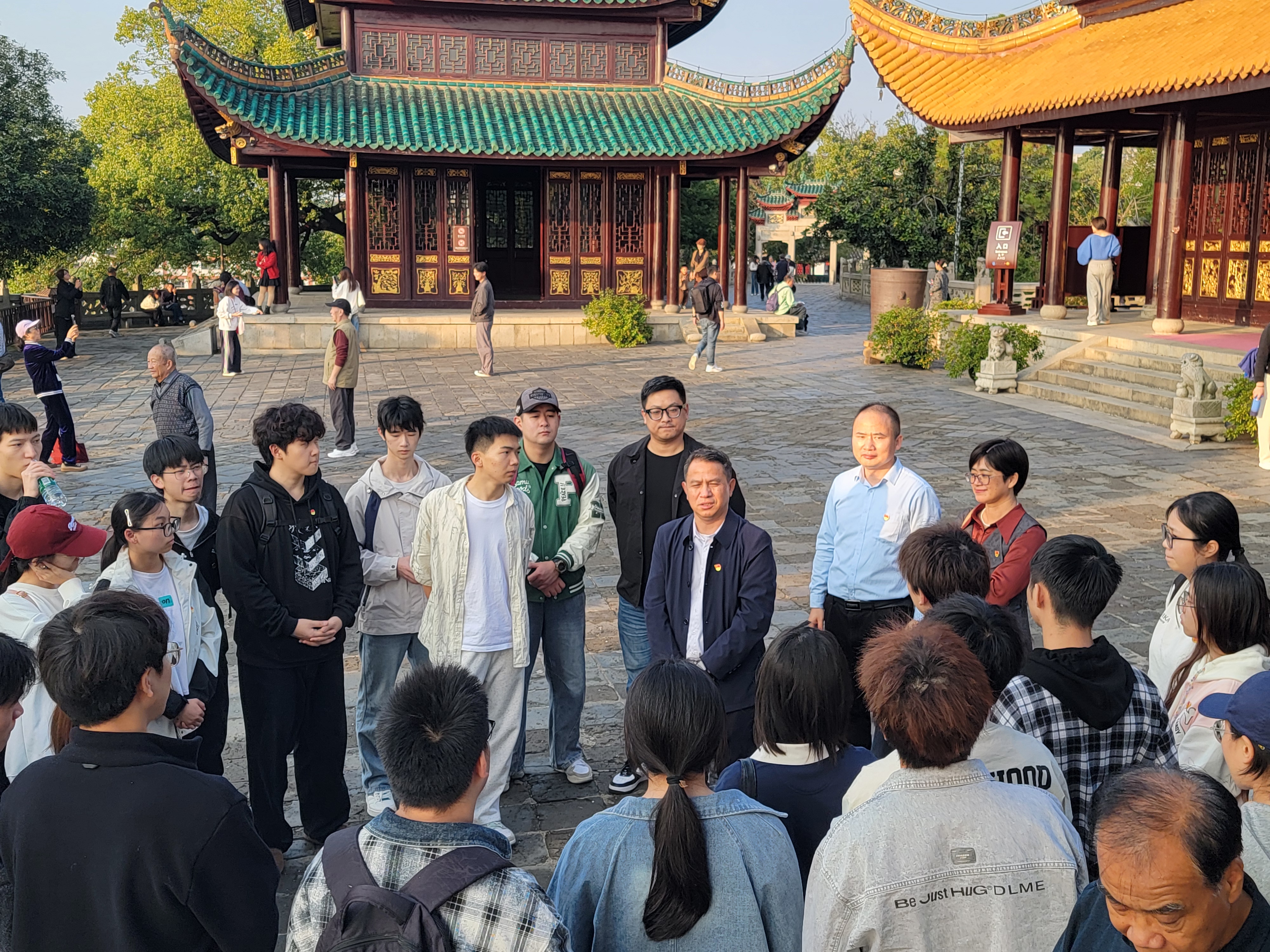 “先天下之忧而忧,后天下之乐而乐”,范仲淹笔下的岳阳楼不仅是江南文化地标,更是中华民族担当精神的象征。师生们沿“仙梅亭—三醉亭—主楼”参观,在讲解员的引导下,深入了解岳阳楼的建筑智慧与人文底蕴:从唐代张说重修楼阁的治世担当,到宋代滕子京“政通人和,百废具兴”的实干精神;从杜甫“戎马关山北,凭轩涕泗流”的家国愁思。一幅幅历史画卷在眼前展开,让“以天下为己任”的精神基因在青年心中悄然扎根。