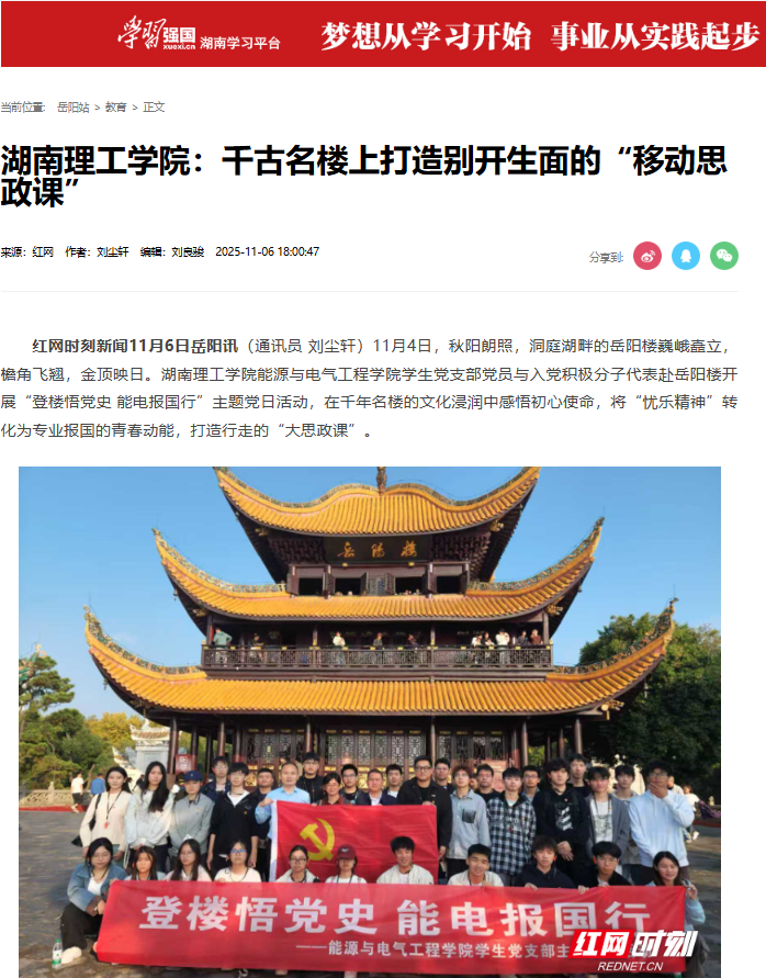 红网时刻新闻11月6日岳阳讯(通讯员 刘尘轩)11月4日,秋阳朗照,洞庭湖畔的岳阳楼巍峨矗立,檐角飞翘,金顶映日。湖南理工学院能源与电气工程学院学生党支部党员与入党积极分子代表赴岳阳楼开展“登楼悟党史 能电报国行”主题党日活动,在千年名楼的文化浸润中感悟初心使命,将“忧乐精神”转化为专业报国的青春动能,打造行走的“大思政课”。