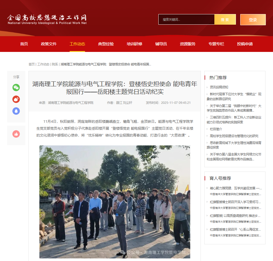 校园网讯 近日,我校能源与电气工程学院《登楼悟史担使命 能电青年报国行——岳阳楼主题党日活动纪实》获教育部全国高校思想政治工作网报道。