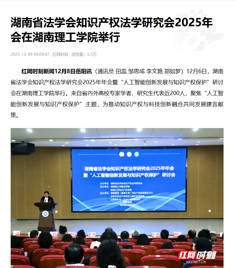 红网时刻新闻12月8日岳阳讯(通讯员 田蕊 邹思成 李文艳 郑如梦)12月6日,湖南省法学会知识产权法学研究会2025年年会暨“人工智能创新发展与知识产权保护”研讨会在湖南理工学院举行。来自省内外高校专家学者、研究生代表近200人,聚焦“人工智能创新发展与知识产权保护”主题,为推动知识产权与科技创新融合共同发展建言献策。