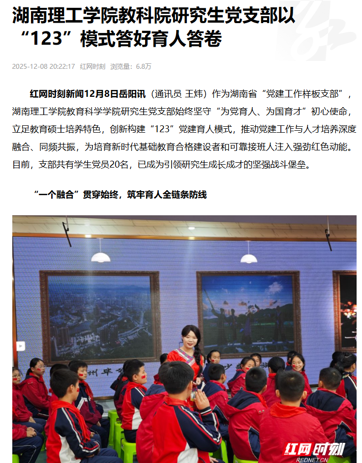 红网时刻新闻12月8日岳阳讯(通讯员 王炜)作为湖南省“党建工作样板支部”,湖南理工学院教育科学学院研究生党支部始终坚守“为党育人、为国育才”初心使命,立足教育硕士培养特色,创新构建“123”党建育人模式,推动党建工作与人才培养深度融合、同频共振,为培育新时代基础教育合格建设者和可靠接班人注入强劲红色动能。目前,支部共有学生党员20名,已成为引领研究生成长成才的坚强战斗堡垒。