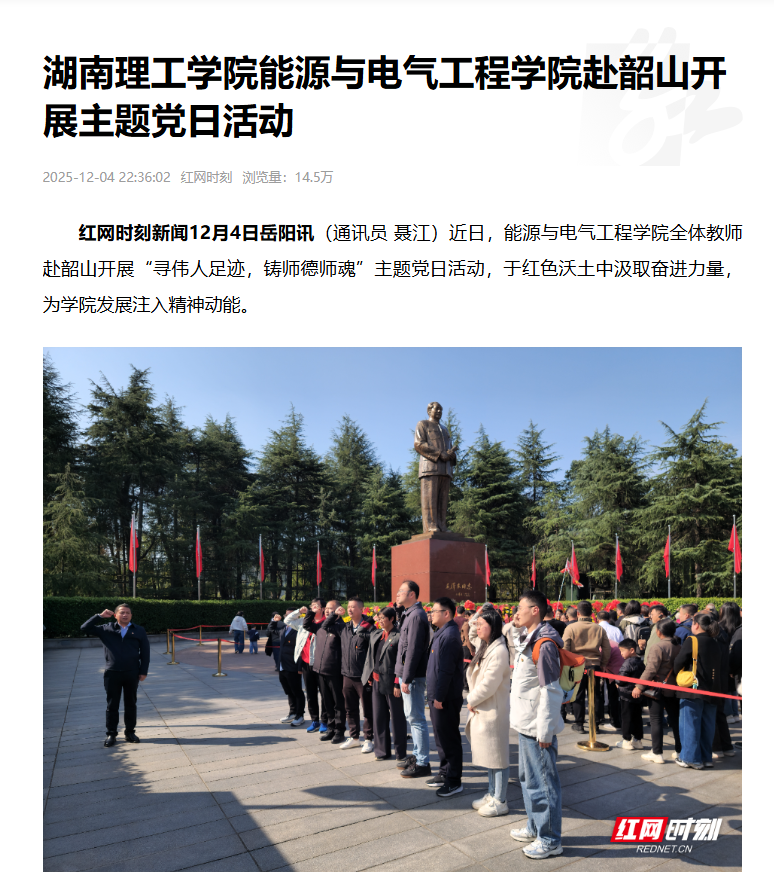 红网时刻新闻12月4日岳阳讯(通讯员 聂江)近日,能源与电气工程学院全体教师赴韶山开展“寻伟人足迹,铸师德师魂”主题党日活动,于红色沃土中汲取奋进力量,为学院发展注入精神动能。