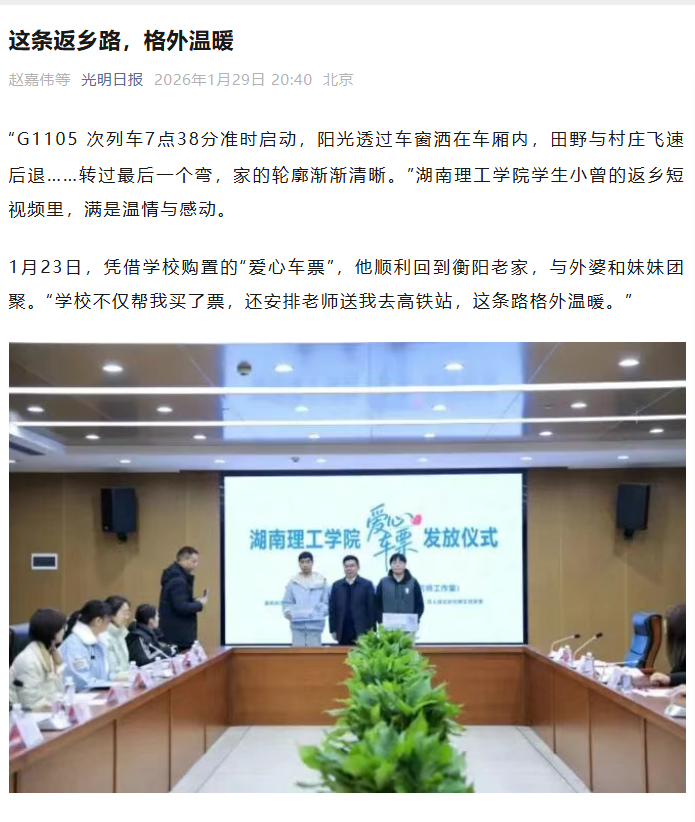记者了解到,湖南理工学院“爱心车票”育人举措已经连续实施了八年。一张小小的车票,串联起的是学校对学生的深深关爱,更是教育者的责任与担当。下一步,学校将继续完善“爱心车票”资助育人体系,力争做到精准资助全覆盖,让每一位归乡的学子在路上感受到温暖和爱。