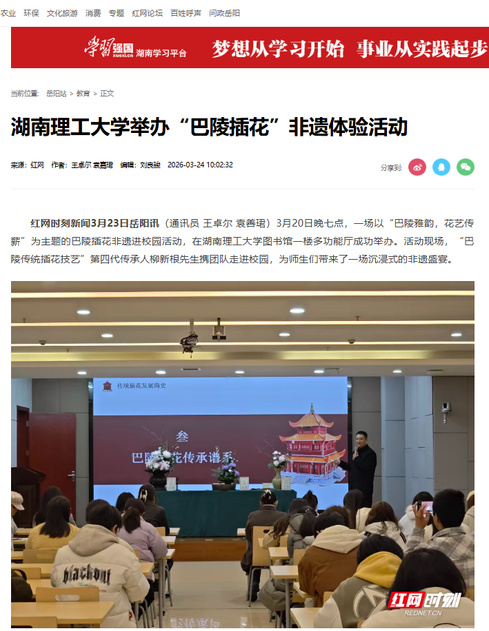 红网时刻新闻3月23日岳阳讯(通讯员 王卓尔 袁善珺)3月20日晚七点,一场以“巴陵雅韵,花艺传薪”为主题的巴陵插花非遗进校园活动,在湖南理工大学图书馆一楼多功能厅成功举办。活动现场,“巴陵传统插花技艺”第四代传承人柳新根先生携团队走进校园,为师生们带来了一场沉浸式的非遗盛宴。