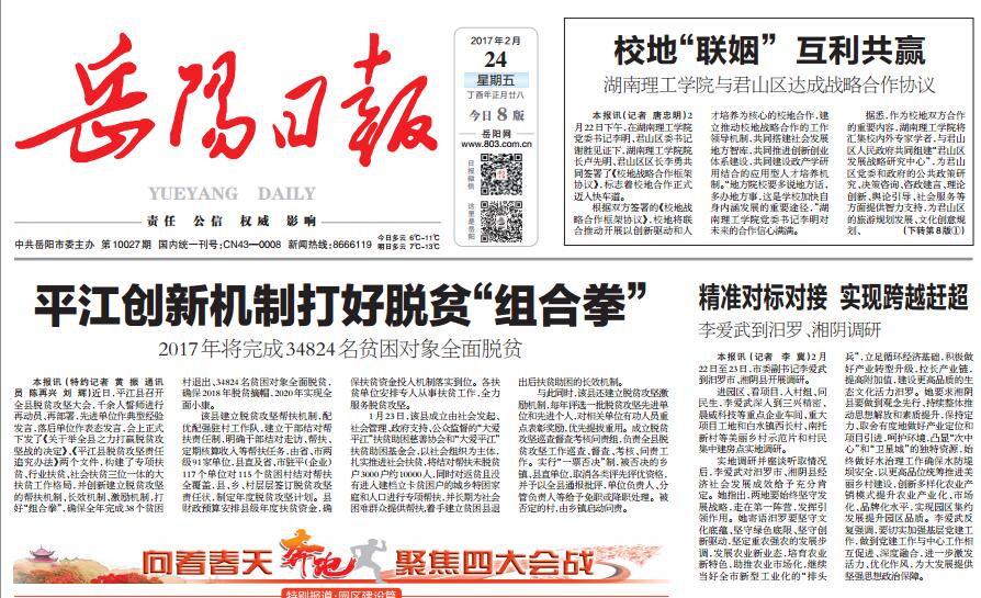 根据双方签署的《校地战略合作框架协议》,校地将联合推动开展以创新驱动和人才培养为核心的校地合作,建立推动校地战略合作的工作领导机制,共同搭建社会发展地方智库,共同推进创新创业体系建设,共同建设政产学研用结合的应用型人才培养机制。“地方院校要多说地方话,多办地方事,这是学校加快自身内涵发展的重要途径,”湖南理工学院党委书记李明对未来的合作信心满满。