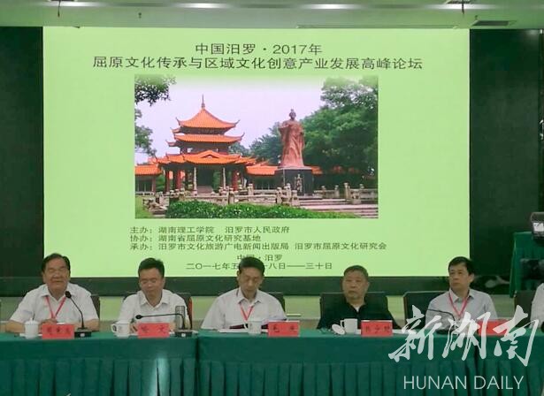 屈原文化传承与区域文化创意产业发展高峰论坛,由湖南理工学院和汨罗市政府共同举办,是汨罗市“我们的节日?端午”——屈子文化园开园系列活动重要组成部分。会上,黄凤显、蔡靖泉、鲁瑞菁、龚红林、赵敏俐、任国瑞等专家交流了最新学术研究成果;与会专家围绕屈子文化园内涵式发展落地策略、龙舟节庆产业化落地策略、“中国汨罗?诗祖屈原?国际诗人节”实施策划、学术期刊《屈原研究?创刊号》审读及办刊论证、湖南省屈原文化研究基地建设及其他关于屈原与当代文化建设等论题,进行了深入研讨,达成共识。