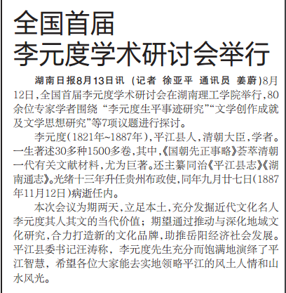 湖南日报8月13日讯(记者 徐亚平 通讯员 姜蔚)8月12日,全国首届李元度学术研讨会在湖南理工学院举行,80余位专家学者围绕“李元度生平事迹研究”“文学创作成就及文学思想研究”等7项议题进行探讨。