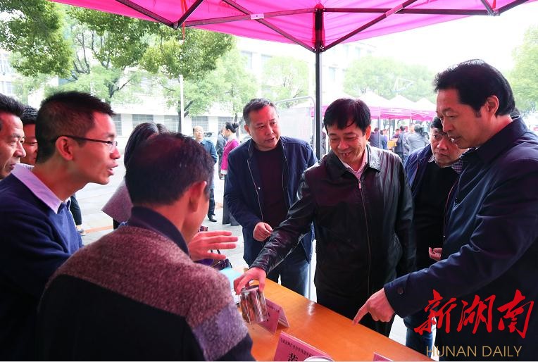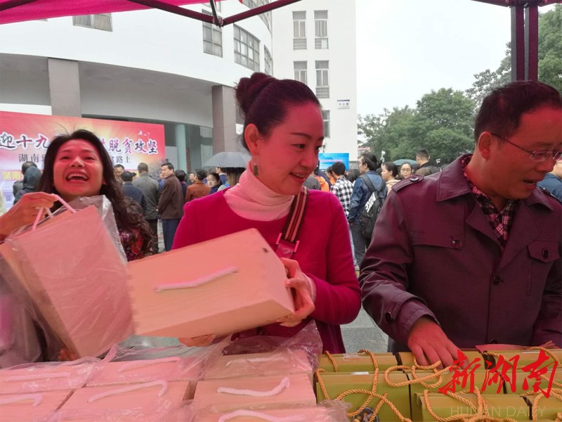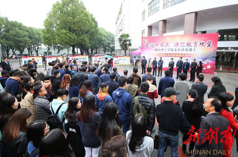 新湖南客户端10月17日讯(记者 徐亚平 通讯员 司念伟)“非常感谢湖南理工学院扶贫队,在他们的帮扶下,村里有产业支持,大伙儿致富奔小康的劲头更足了,可以说是富了口袋富脑袋。全村百姓都夸党的政策好!”今天,来自平江县童市镇大糙村的村民丁拥军高兴地说。正逢全国第四个“扶贫日”,湖南理工学院在校园里举办了扶贫成果展暨扶贫产品展销会,吸引了广大教职工和市民前来“赶集”。