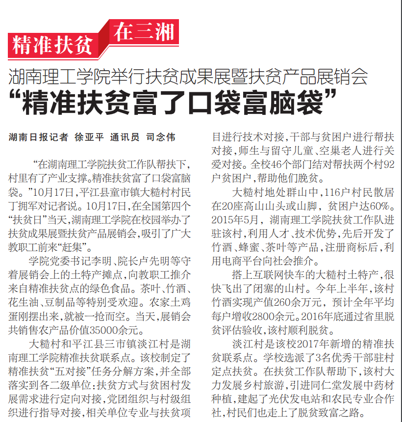 “在湖南理工学院扶贫工作队帮扶下,村里有了产业支撑。精准扶贫富了口袋富脑袋。”10月17日,平江县童市镇大糙村村民丁拥军对记者说。10月17日,在全国第四个“扶贫日”当天,湖南理工学院在校园举办了扶贫成果展暨扶贫产品展销会,吸引了广大教职工前来“赶集”。