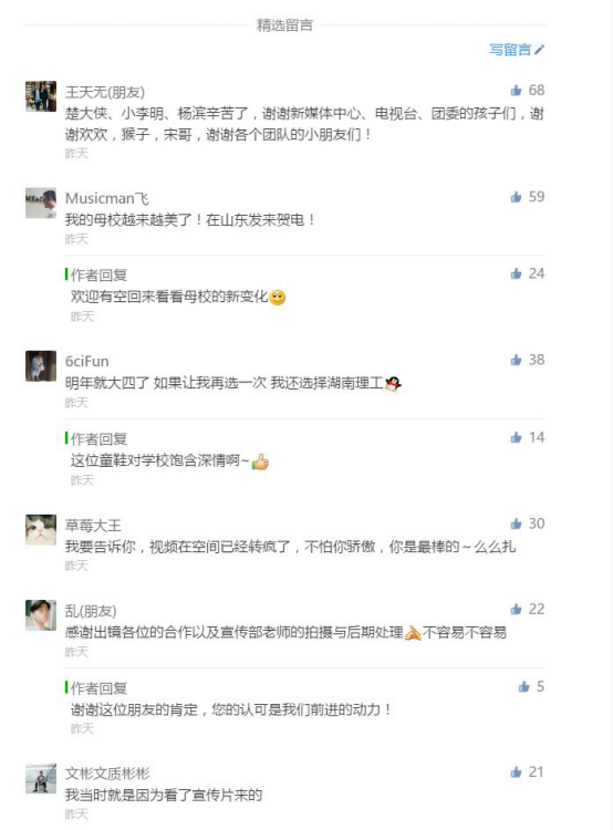 6月26日凌晨1点30,随着湖南理工学院官方微信公众号当天的推送,凝聚着“湖理小节奏”摄制组三位老师心血与汗水的2分半钟的短片正式推出了。这部短片在官方微信以“150秒带你领略湖南理工学院小节奏”为标题。推出后,迅速圈粉,到当天早上8点,微信阅读量就达到近4000,随着时间不短往前推移,到发稿时为止,腾讯视频阅读量已达21.7万,微信阅读量达17820次,收获了343个赞、1623次转发以及宝贵的338条留言(微信公众号最多只能放出100条精选留言)。在留言中,除了在校师生对影片的溢美之辞,还有校友被影片精彩唯美的画面感动到热泪盈眶,有校友被影片中母校日新月异的发展风貌引发了浓浓的思念之情,也有校友受影片的感染迸发出强烈的自豪感和荣誉感。