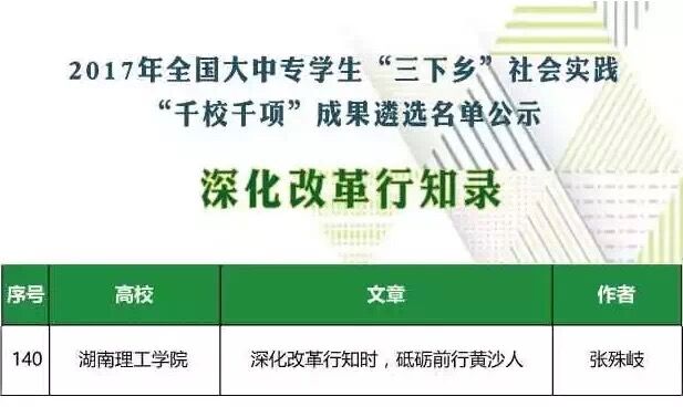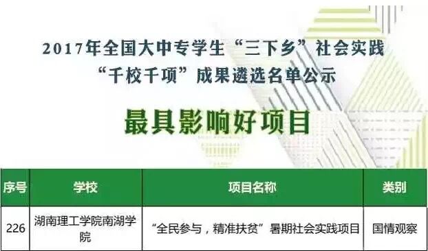 校园网讯 近日,团中央学校部发布2017年全国大中专学生暑期“三下乡”社会实践“千校千项”成果遴选结果。活动期间,评委会共收集到2万余份申报材料,经过作品申报、资格筛选、网络投票、专家评审等环节,最终遴选出最具影响好项目300个、真情实感志愿者300名、深化改革行知录200篇以及下乡情怀好日记200篇。我院“全民参与,精准扶贫”暑期社会实践项目获得2017年全国大中专学生“千校千项”“最具影响好项目”荣誉称号,工程系党总支副书记张殊岐的《深化改革行知时,砥砺前行黄沙人》入选“深化改革行知录”,我院成为湖南省唯一获此殊荣的独立学院。