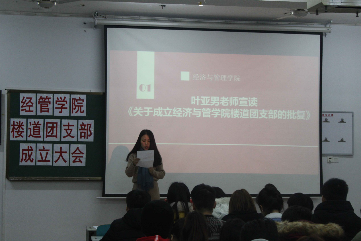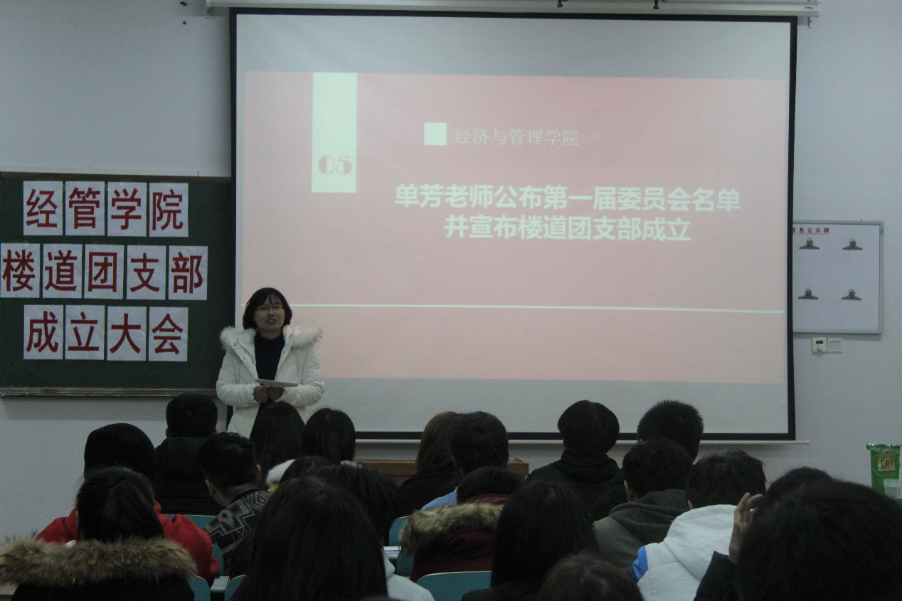 成立会议宣读《关于成立经济与管理学院楼道团支部的批复》。经管学院楼道团支部筹备小组代表介绍了楼道团支部现阶段筹备的基本情况。在激昂的国歌声中全体委员进行了无记名投票,经过监票、计票等程序,成功选举出了第一届经管学院楼道团支部委员会成员。