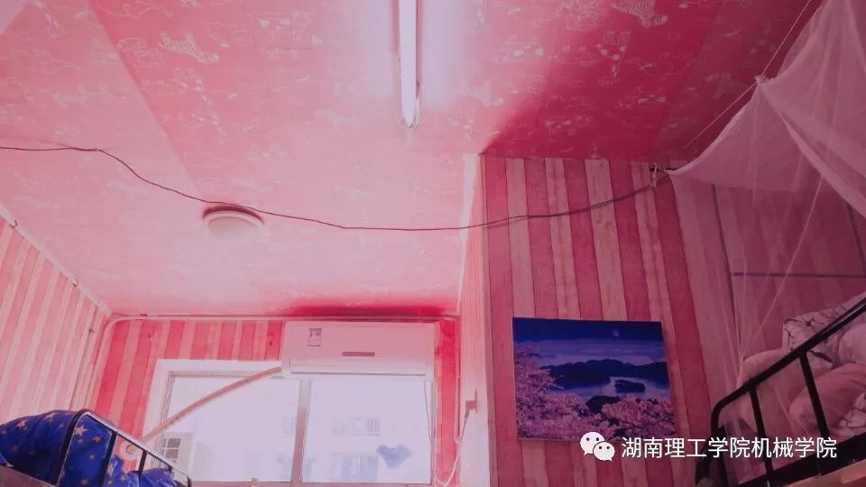 粉壁纸,大镜子,再加上可爱的玩偶,这个精致漂亮的房间出自于我院女寝7209。四名女生将天花板和墙壁分开,搭配上颜色相近的壁纸,既不单调又不突兀,这样的暖色调,让人一推开门就感到温馨与舒适。
