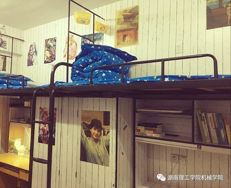 较之女生,男生们似乎更加注重舒适,也更喜欢拥有个人私密的空间,8304、8310的同学安上了吊椅床帘,运用简单的花纹作为背景,再贴上一些自己喜欢的海报,整齐的排版让寝室不再那么单调,营造了一种复古怀旧的风格。