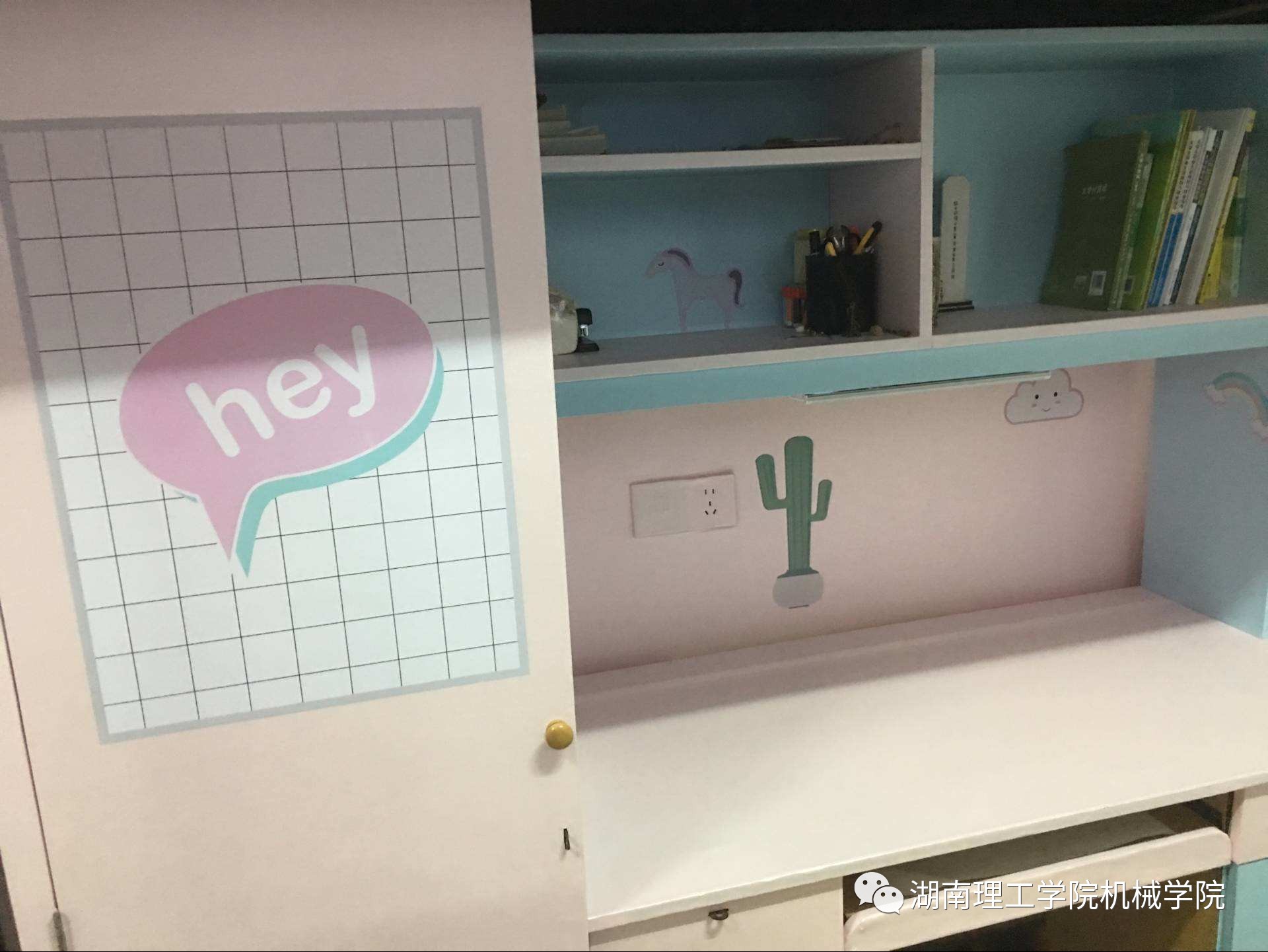 8423是不是让你觉得眼前一亮?粉嫩的颜色,可爱的图案,居然连插座也进行了点缀,细节装饰甚至让女生都自愧不如。还有由一块块的字母拼成的小地毯,带着童真的感觉,只要有心,谁都能让自己的寝室展现出不一样的风采。