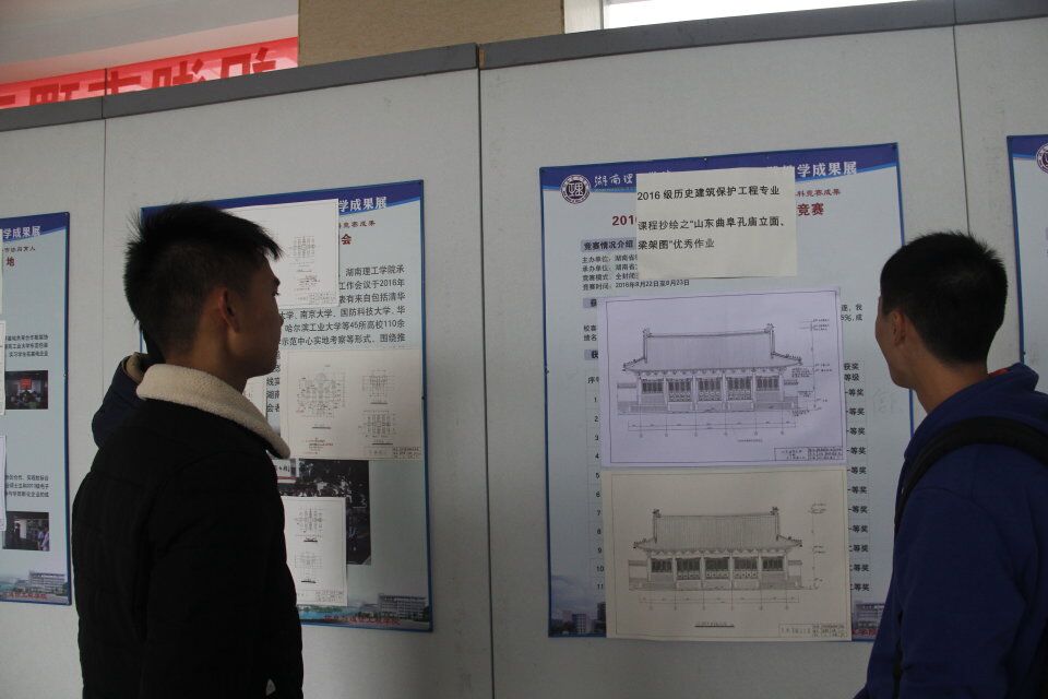 校园网讯 12月13-22日,土建学院2015级、2016级历保班“优秀作业”成果展于16栋逸夫楼二楼平台举办。本次展会由历保专业指导老师李祎组织,展出了“宋式七铺作重栱双杪双下昂斗栱”、“清式单翘单昂五踩平身科”及“山东曲阜孔庙梁架图、立面图”等优秀课程设计及抄绘。