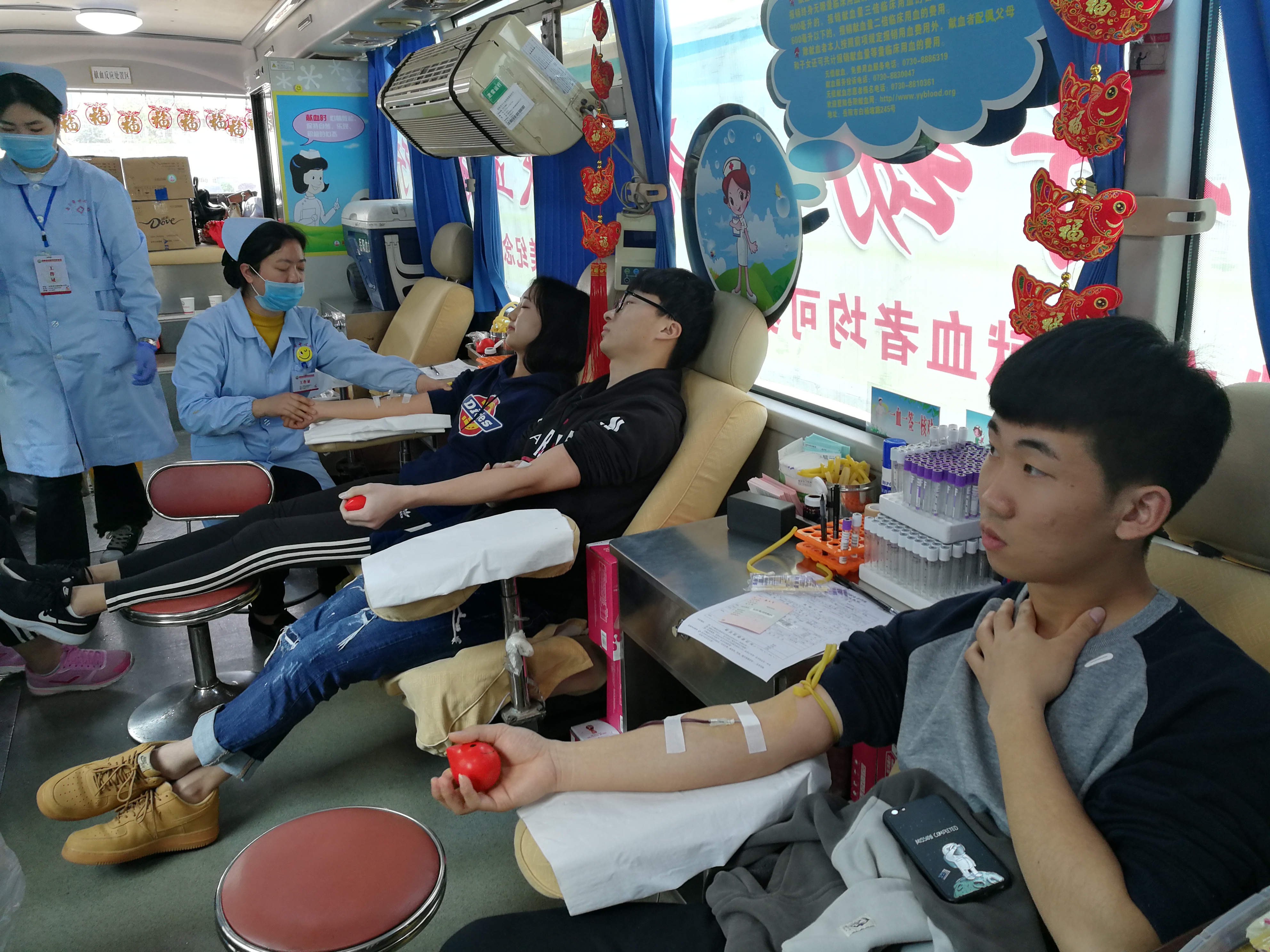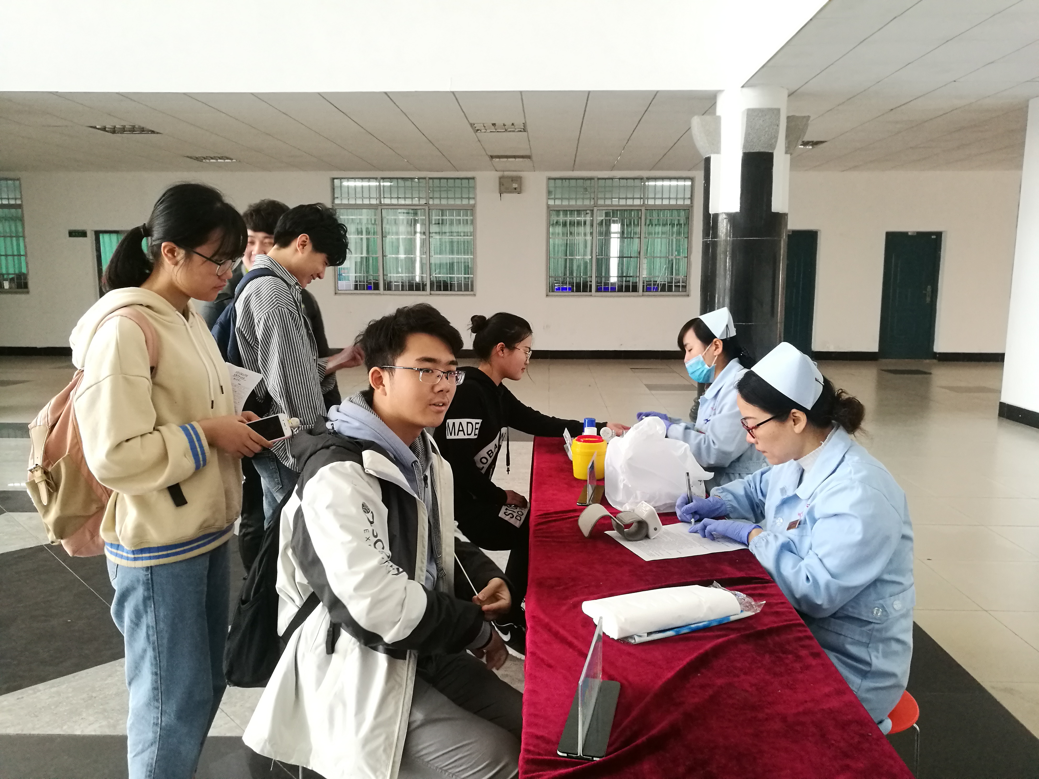 在此次献血活动中,岳阳市中心血站的多位医护人员来到现场与同学们进行了零距离的接触,为同学们检查身体,普及献血知识等等。数学学院青志中心志愿者以及团学分会的学生干部积极配合医护人员的工作,参与组织现场填表,维持现场秩序的工作。各位同学们积极参与其中,为公益献血事业贡献出自己的力量。(责编/潘星羽)