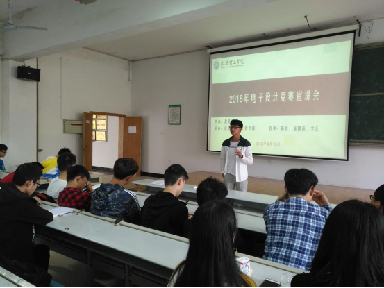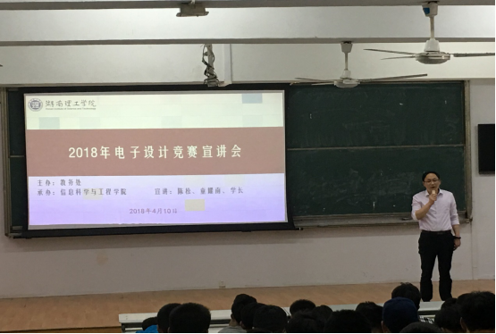 校园网讯 4月10日下午,信息科学与工程学院在6T1、7T1、8T1教室召开2018年学校电子设计竞赛宣讲会。副院长童耀南、创新基地主任陈松主讲,信科院及南湖学院17级共700余名同学聆听讲座。