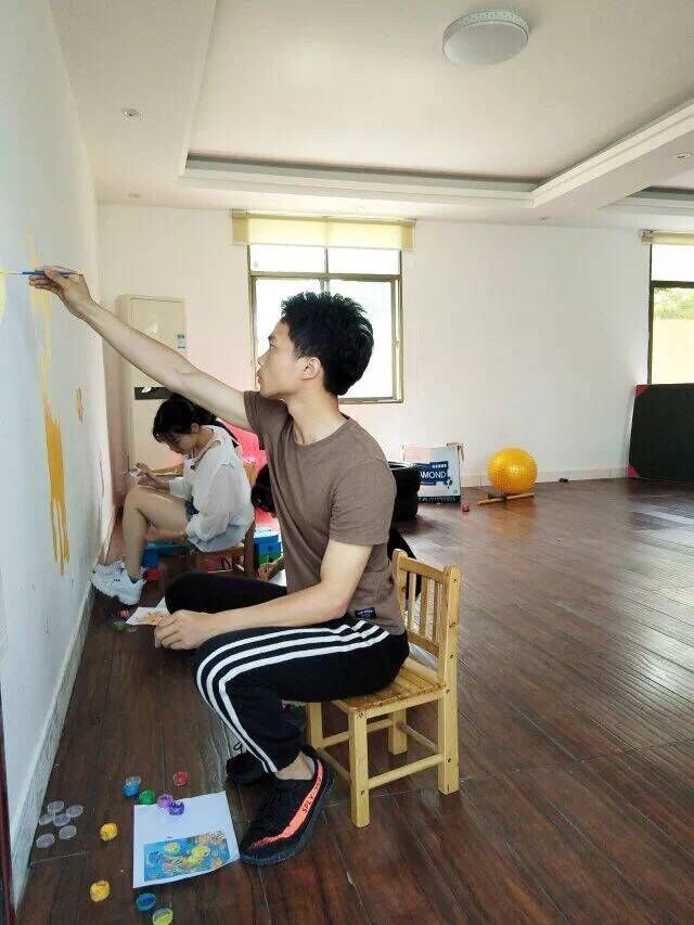 他们分工明确:有的负责构图,在墙体上勾勒出清晰的轮廓;有的负责调色,红的、黄的、白的、黑的颜料在灵巧的双手间生成七彩斑斓;有的负责涂色,拿起画笔在墙体上细致涂刷。就这样,各式各样的卡通画通过志愿者们灵巧的双手,在原本空白的墙面开始生动、鲜活起来。经过近五个多小时的精雕细琢,需要绘制的墙面基本已经全部完成。志愿者们有些许疲惫,但看着自己的辛勤成果,想着能给那些“折翼的小天使们”增添些许色彩,大家都欣慰的笑了,绘制完成的涂鸦墙也生动活泼、图文并茂。