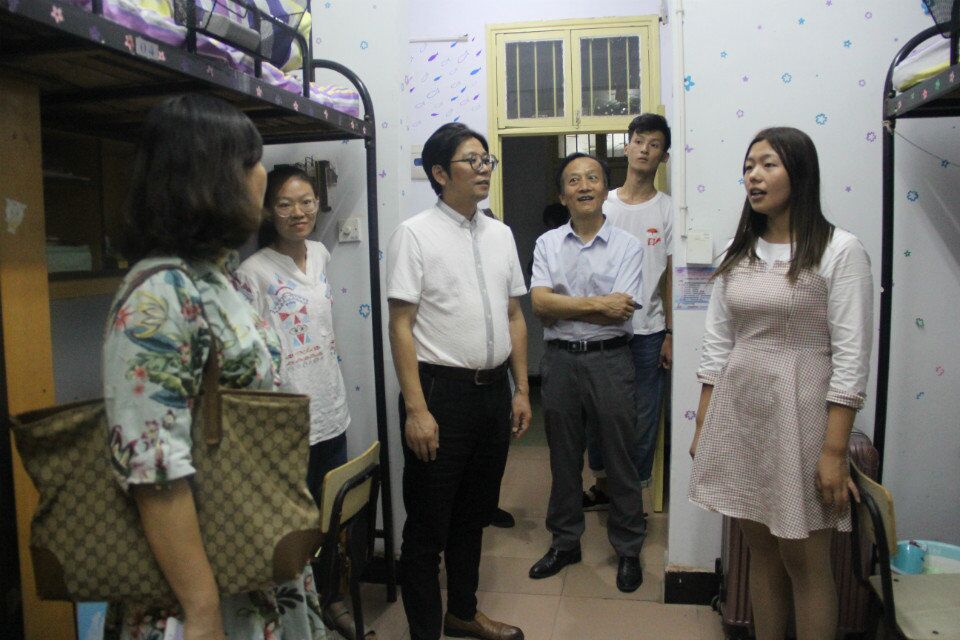 校园网讯 新学期伊始,为深入了解学院新生的入学情况,及时掌握学生思想动态,做好新生教育和引导工作,9月8日晚上8点,美设学院院长万长林、党总支书记洪琪、党总支副书记万娟霞以及2018级辅导员陈熹旺在学生干部的陪同下深入学院2018级新生宿舍,亲切询问新生入学情况。