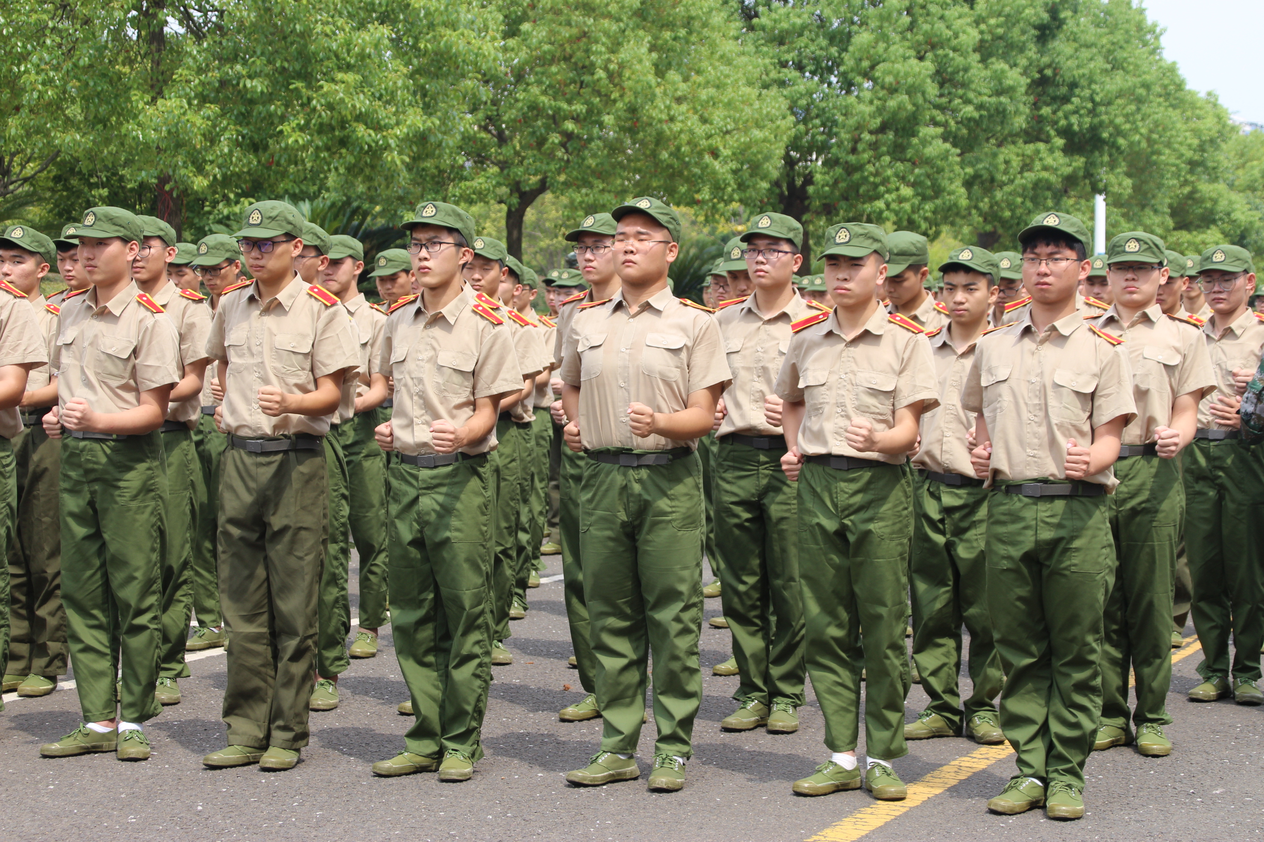 骄阳似火,同学们在教官、班主任、助教及助班的陪伴下反复练习,军姿、稍息、立正、停止间转法,在教官的强调与纠正下努力做得更标准,展现出土建学院2018级新生的昂扬斗志。