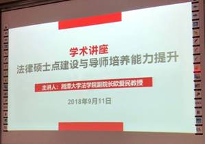 校园网讯 9月11日下午,我院“法律硕士点建设与导师培养能力提升”专题培训在素质拓展室举行,湘潭大学法学院副院长欧爱民教授应邀作专题辅导讲座。专题培训由院长陈建军主持。