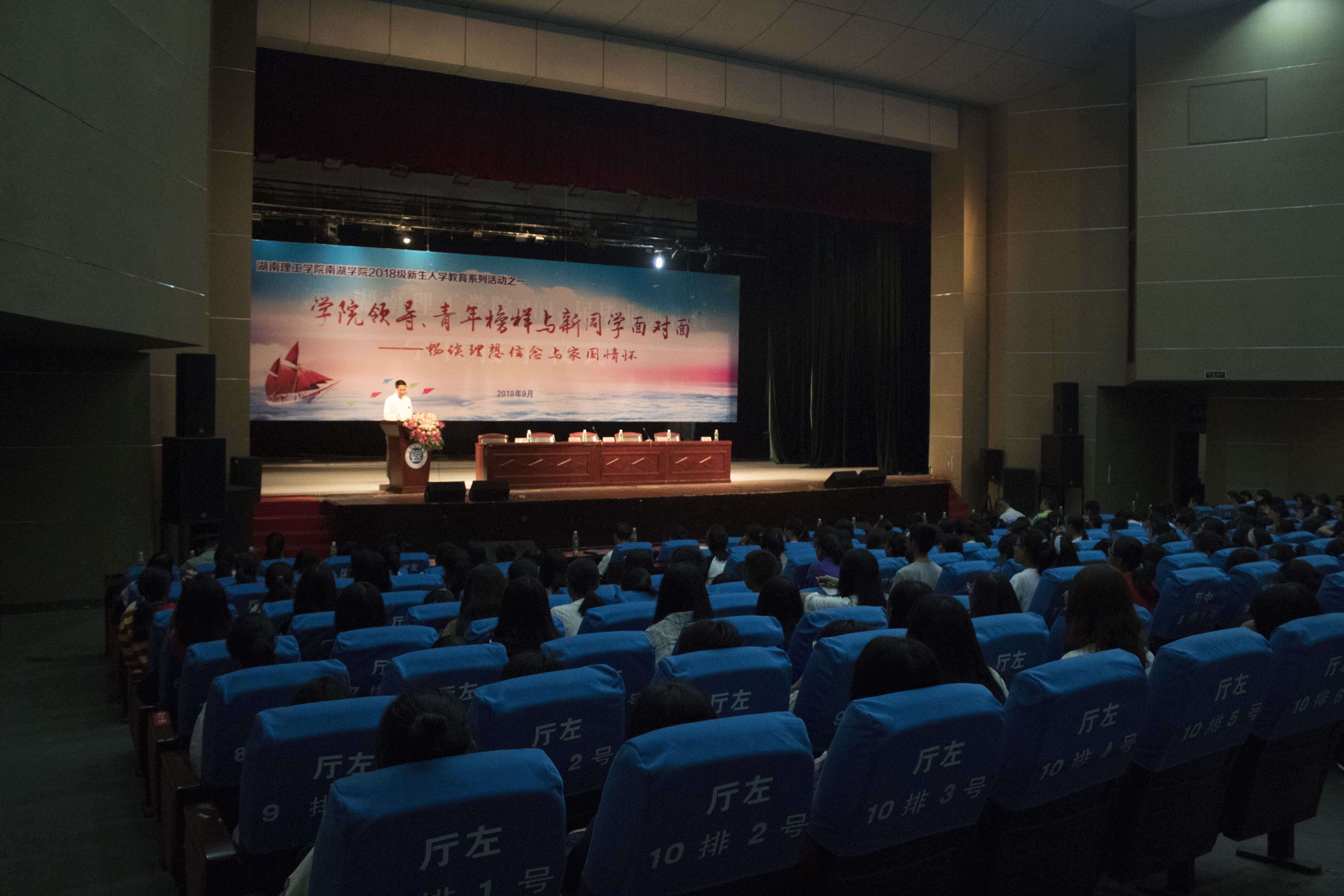 校园网讯 9月21日下午,南湖学院在东院演播厅举行新生入学教育之“学院领导、青年榜样与新同学面对面”活动,南湖学院院长彭平锋、党委书记柳周峰、5名高年级优秀学生代表,与2018级全体新同学畅谈理想信念与家国情怀,活动由副院长李革新主持,南湖学院各系书记、学工办负责人参加活动。
