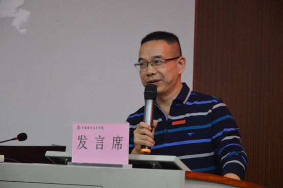 湛朝虎博士代表全院教师发言,他向全体新生分享了一些学习经验,他强调了语音语调的重要性:这是外语学习者的一张名片,提出同学们们要多多使用自己学习的语言,要不断进行语音输入,他告诉同学们“No pains no gains”,一分耕耘一分收获,没有付出,就不会有回报。