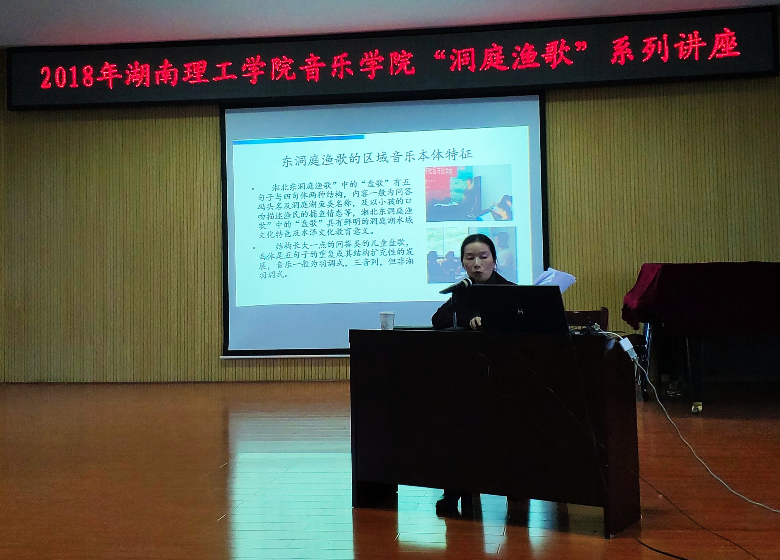 此次系列讲座共分三讲,主题分别是“‘洞庭渔歌’的演唱基础训练”、“‘洞庭渔歌’的特征、历史与现状”和“‘东洞庭渔歌’的音乐本体特征”。上午,由洞庭渔歌省级非遗传承人陈岳林老师、岳阳楼区文广新局夏阳老师以及我院院长柳青老师依次主讲。