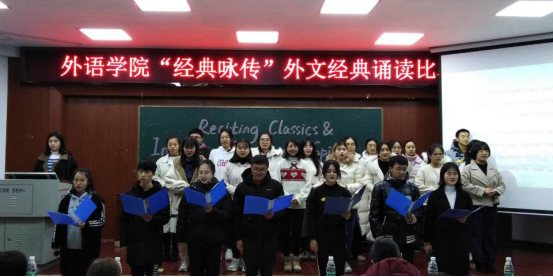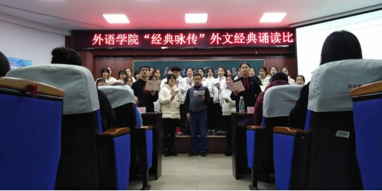 校园网讯 12月27日,外语学院在六栋学术报告厅举办了“经典咏传”外文经典诵读比赛,外语学院副院长邹娟娟、老师金海锦、熊奕、杨天麟担任评委,外语学院党总支书记潘洞庭、副院长毛新耕、副书记石红芳及2018级班主任出席活动,2018级全体学生参加。