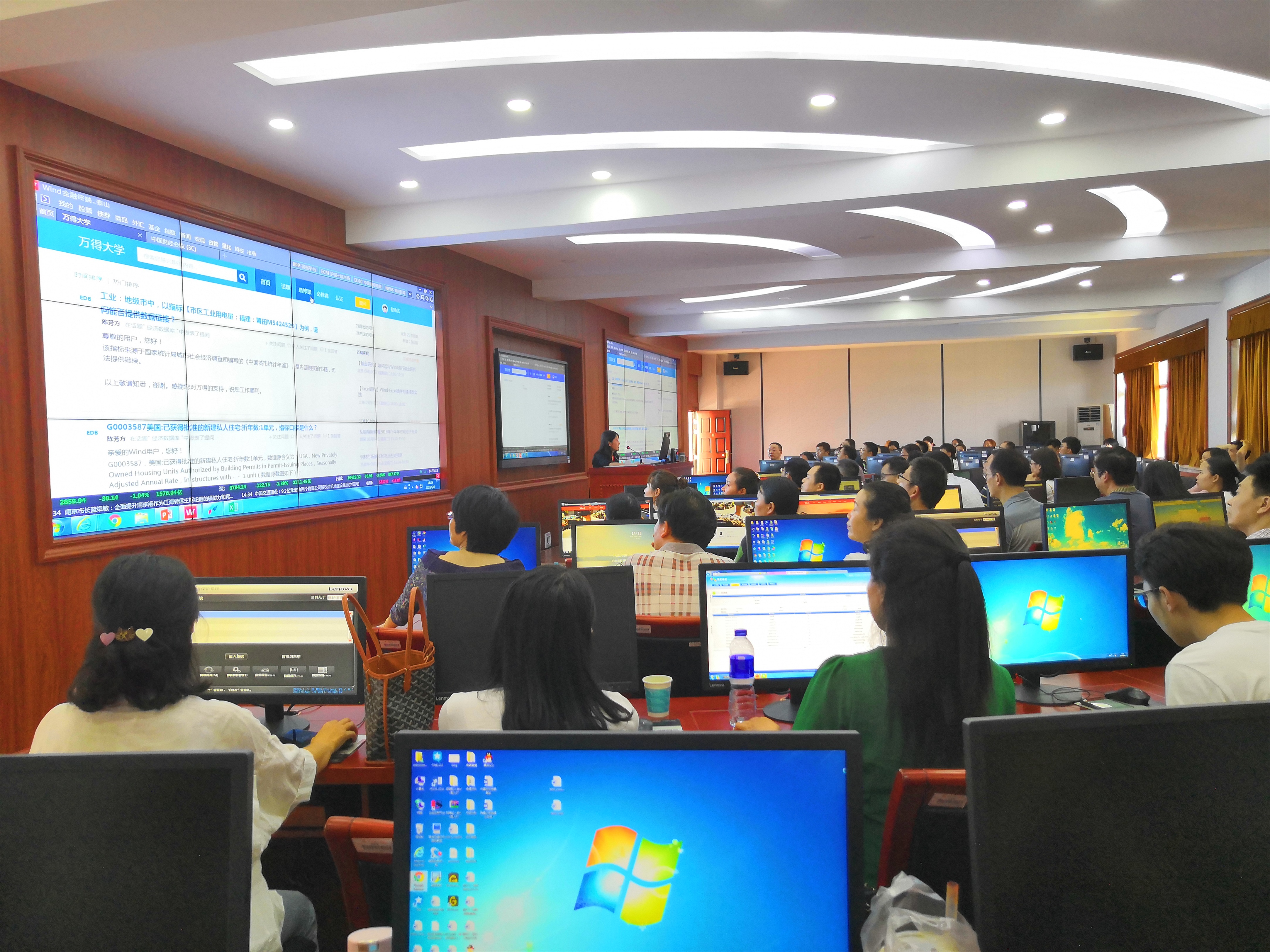 万得金融数据库软件使用培训会上,图书馆陈近副馆长对图书馆的工作以及资源服务做了简短的介绍。陈近主要从远程访问、超星期刊和文献传递等特色功能为大家做了简要介绍,来自万得信息技术股份有限公司的负责人为参会教师进行软件讲解与使用培训,培训会上,万得负责人为学院教师详细介绍了万得信息数据平台使用细则,通过实际操作为大家演示了万得数据库的基础功能和特色功能,包括订阅号、数据提取、宏观数据库、万能搜索框等功能板块,万得公司是中国大陆领先的金融数据、信息和软件服务企业,国内外多家金融企业经常引用万得数据库的数据。