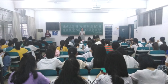 校园网讯 6月28日晚,外语学院于8410召开大学生课前三分钟爱国朗读(第三季)优秀组织奖及五月份学风表彰大会。外语学院党总支副书记石红芳、学工办主任申晓丽、2018级辅导员殷成韵出席会议。外语学院部分学生参加活动。