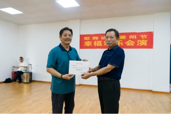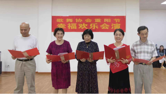 重阳节幸福欢乐会演主要有两个环节,一是离退中心党总支领导为“我和我的祖国”主题文艺作品征集展示,为活动一、二等奖获奖者颁发荣誉证书并留影,主持人为离退中心副处长余长庚同志。二是学校东西南三院的离退休同志分区域共选送19个节目,主持人曹广庚老师,会演过程精彩纷呈,掌声不断。