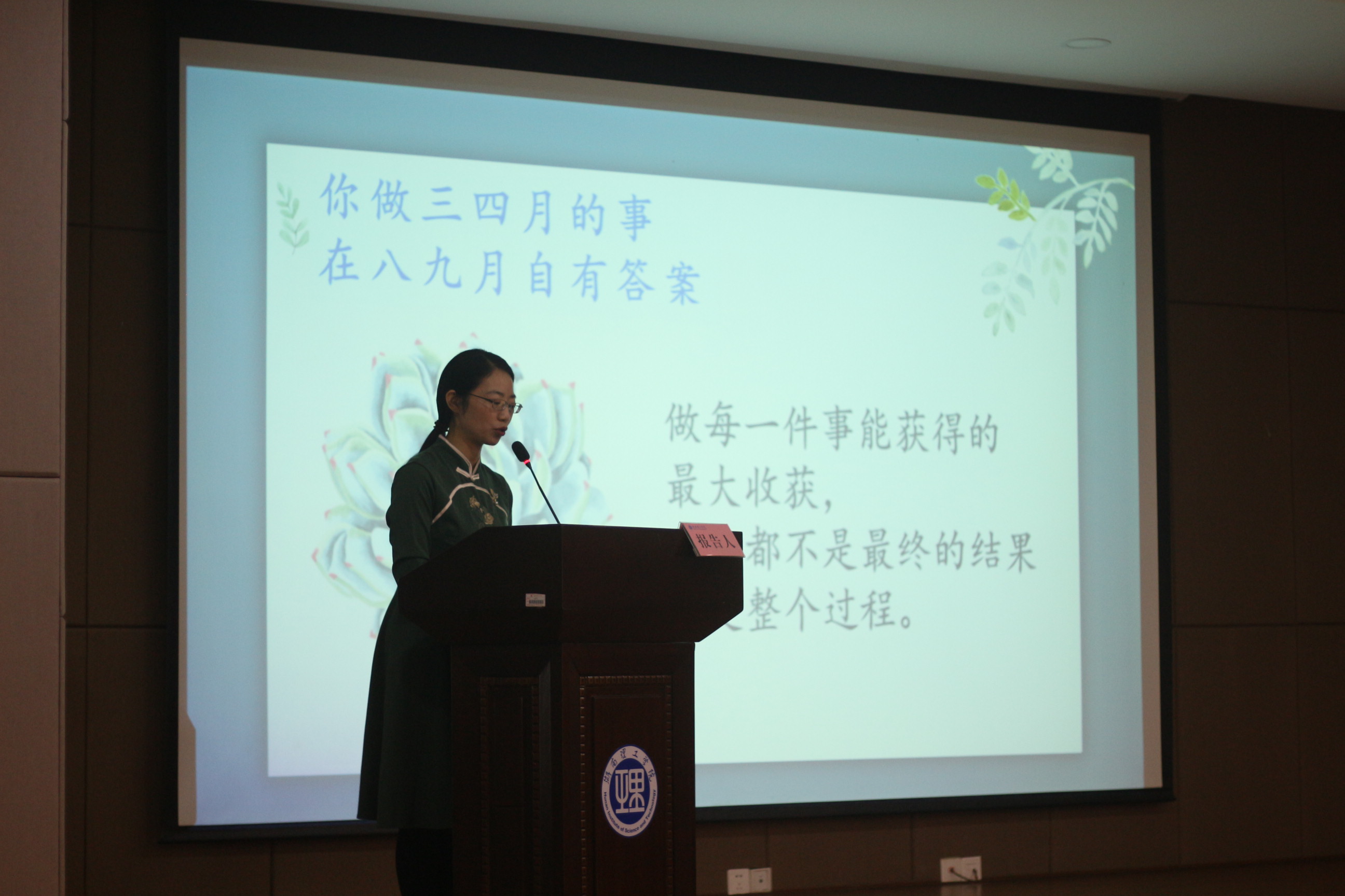 张艳文,有多年的从教经验,非常热爱教育事业。读研期间,荣获教育硕士研究生教学技能竞赛一等奖。她分享的主题是《看,有一道光》。她认为,要取得成功首先要做好人生规划,规划就像一道光,照亮着前行的方向。从读大学的第一天起,她就开始给自己未来的要做一名令学生喜欢的英语老师这个规划努力着,从大二开始利用课余时间积极参加教学技能培训,学校积累的经验让她一毕业就顺利考取了教师编制。她还认为,生活中、工作中要坚持把每一件小事做成极致。每个人在工作和学习领域中总会遇到很多不擅长的事,只有认认真去接受并很好的完成它,在这个过程中你会有很多的成长和解锁各种各样的新技能,就会成为这个行业的专家。她建议大家不要在意眼前的得失,付出总会是有收获的。最后她送给所有在场的同学们一句话“以梦为马,不负韶华。”