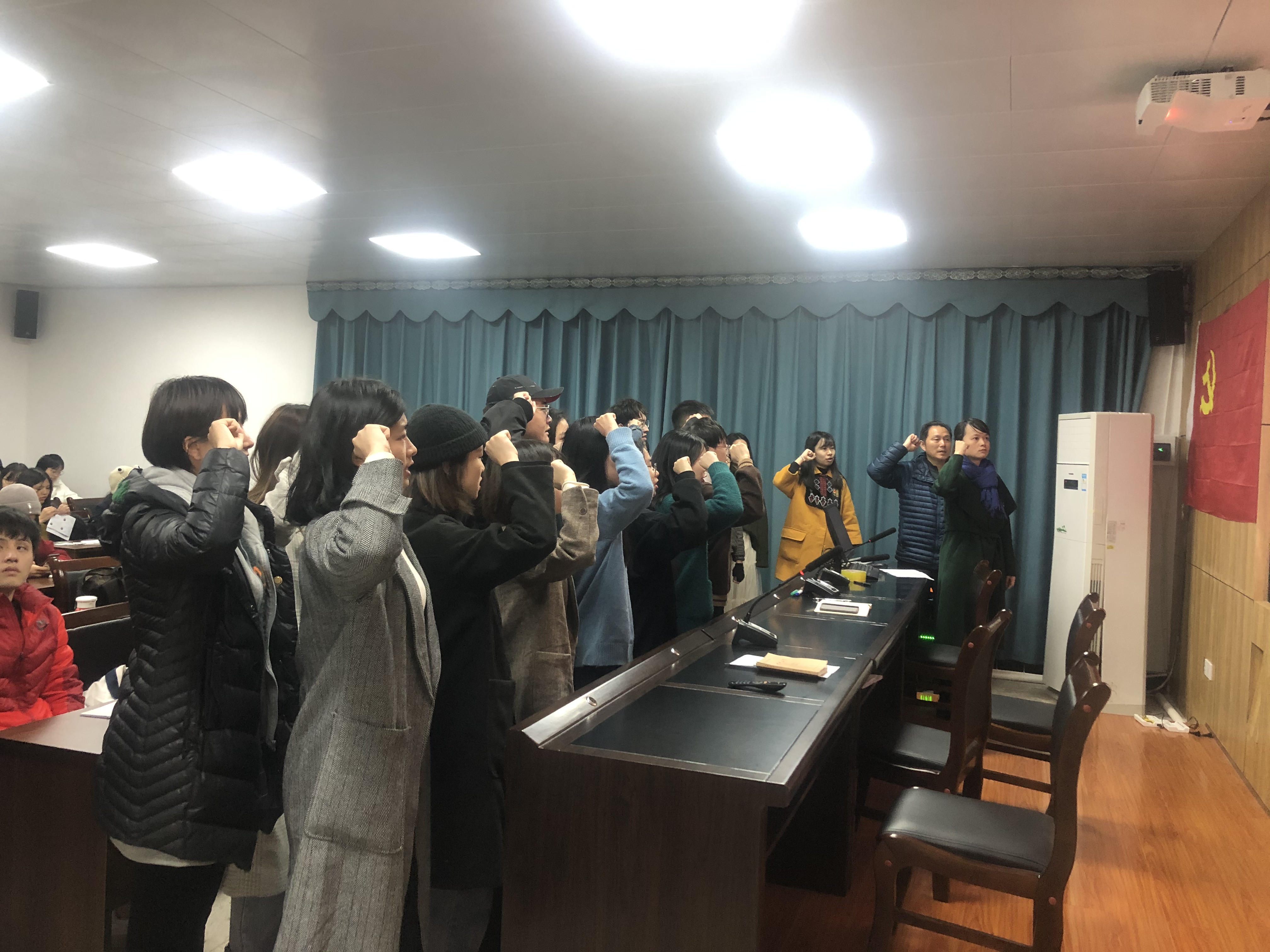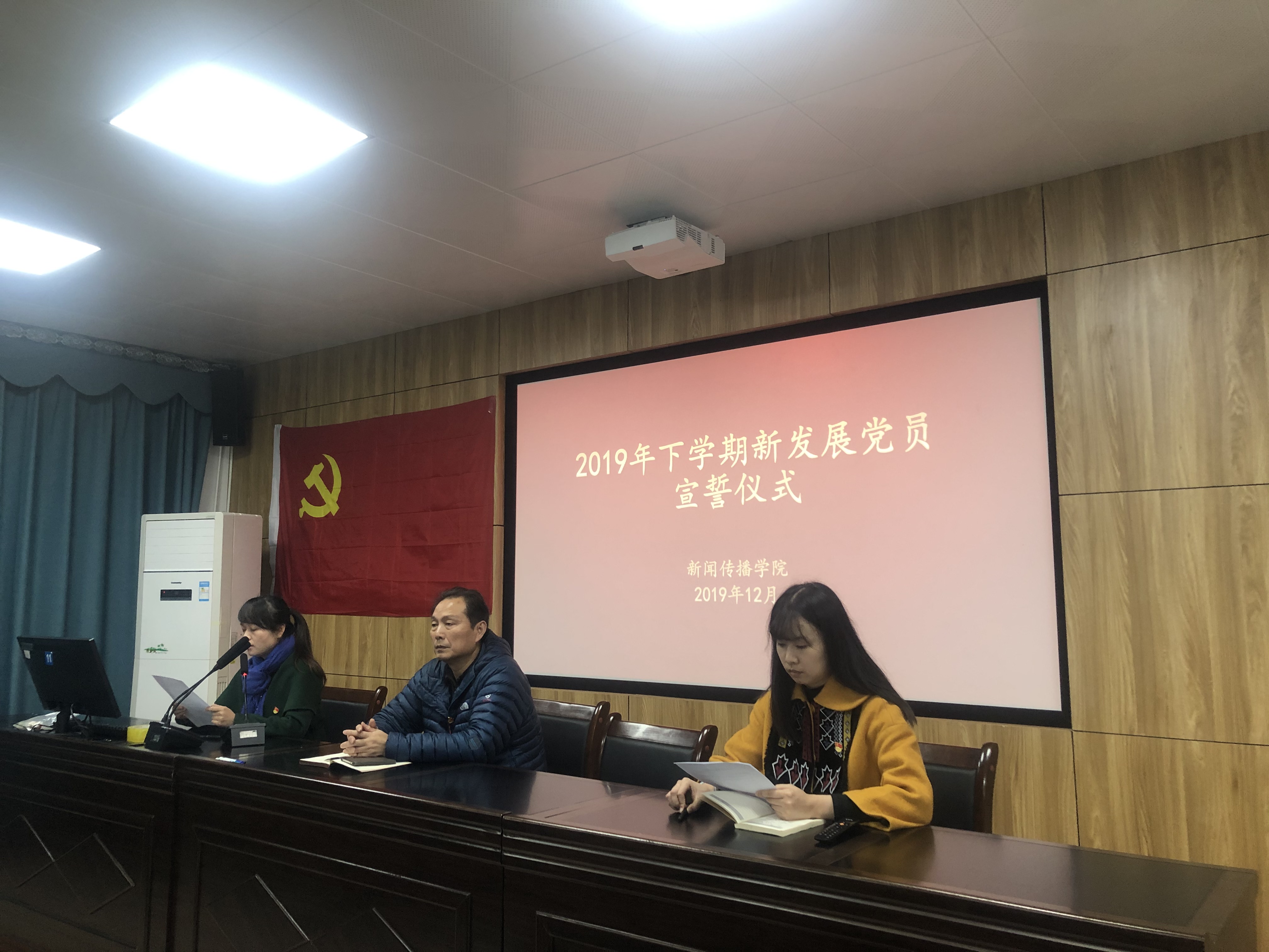 校园网讯 12月10日中午,新闻学院在9401教室举行2019年下学期新党员宣誓仪式,新闻学院党总支书记方庭、组织员兼学生一党支部书记曹玲、学工班主任兼学生二党支部书记李罗娜,新闻学院全体党员以及第41期入党积极分子参加会议。
