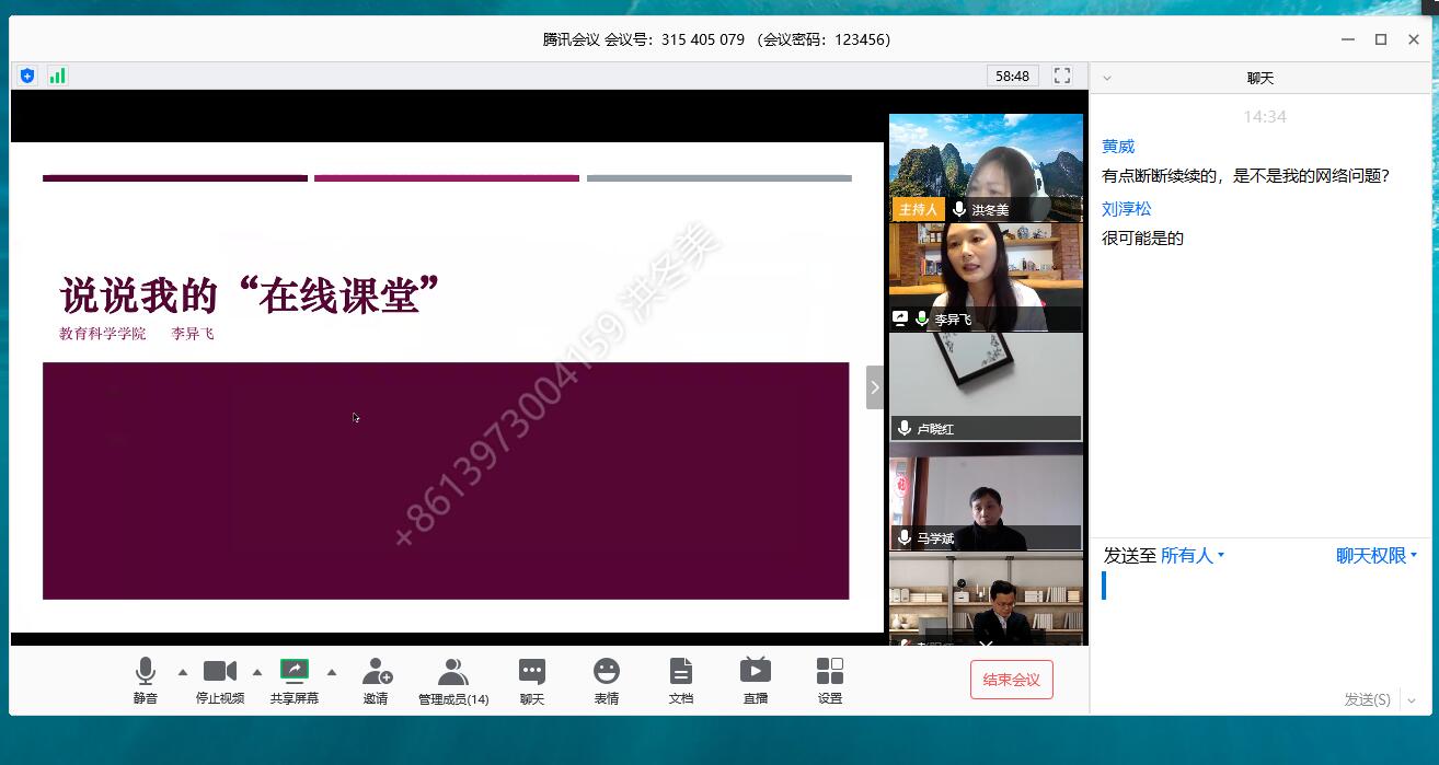 赖颖慧和李异飞分别做主题发言。赖老师以“线上教学的教研交流”为题介绍自己《教育心理学》课程的线上教学思路,并回放一段自己线上课堂教学实录,提出了改进线上教学效果的设想。李老师以“说说我的‘在线课堂’”为主题详细地阐述了自己任教的《教育政策法规与教师职业道德》课程线上教学的设计思路、教学体会与反思。