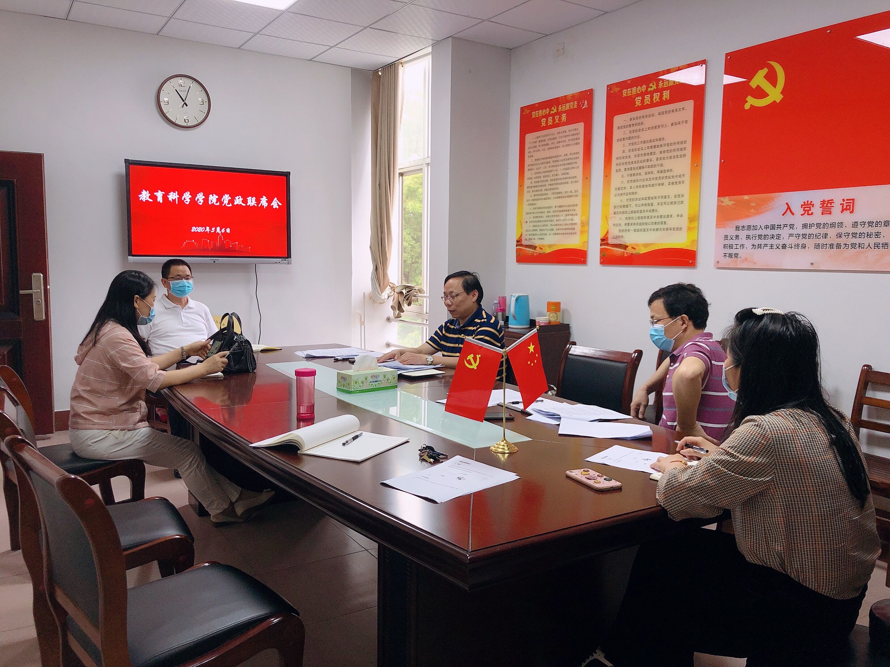 校园网讯 5月6日上午,教育科学学院在综合楼314会议室召开党政联席会议,专题研究2020年教育硕士(教育管理专业和小学教育专业)研究生网络远程复试工作。学院领导班子成员刘理、刘淳松、彭阳红,党总支委员洪冬美,办公室主任刘青姗,教学秘书王炜参会。