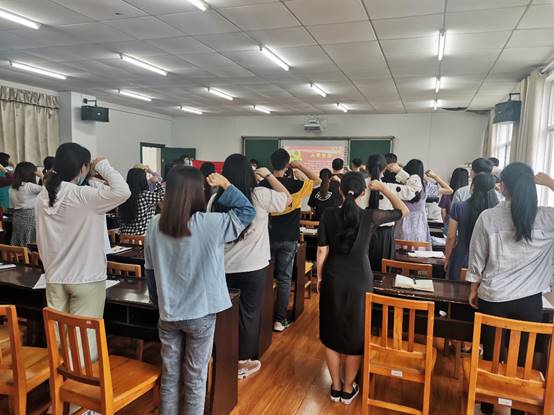 主题教育活动在与会人员庄严地齐唱国歌中开始。全体毕业生党员面向党旗庄严宣誓,重温入党誓词,牢记党员身份和使命。