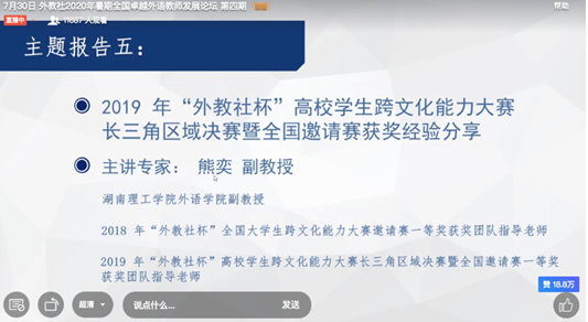 作为主讲嘉宾之一,熊奕老师与北京外国语大学孙有中教授、上海外国语大学张红玲教授、华中科技大学彭仁忠教授等国内知名学者一起,同全国高校11000余名外语骨干教师共同探讨外语教学中的跨文化能力培养问题。熊奕老师以“赛教互促,励学笃行”为题,特别分享了我院跨文化团队率学生荣获2019年“外教社杯”高校学生跨文化能力大赛全国一等奖的获奖经验,她认为跨文化能力大赛促进了英语课堂教学内容的改革,对教师团队建设与个人发展、学生成长起到了的“杠杆”的作用,同时也促进了学科建设与学院发展。