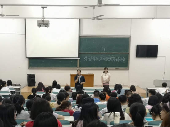 校园网讯 9月9日晚上,外语学院在9T2举行2017级实习动员大会,外语学院副院长邹娟娟、党委副书记石红芳出席,2017级全体学生参加。