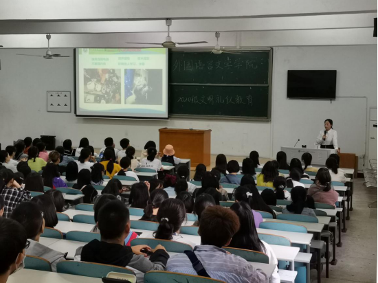 校园网讯 9月24日下午,外语学院在9T1开展新生入学教育之文明礼仪教育讲座,党委副书记石红芳担任主讲人,外语学院2020级全体学生参加。