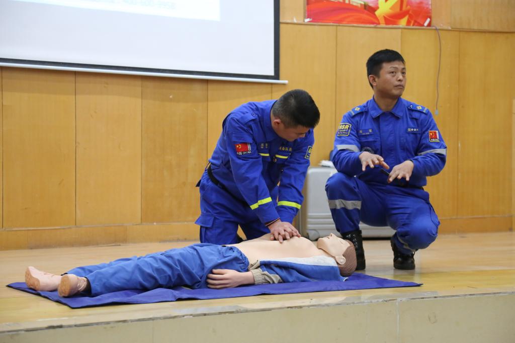 刘军讲解了心肺复苏术的具体措施、正确按压姿势与频率、深度及吹气比例,详细介绍了“海姆立克”急救法的操作步骤,并开展了现场假人示范教学,邀请了2名同学进行实操体验。