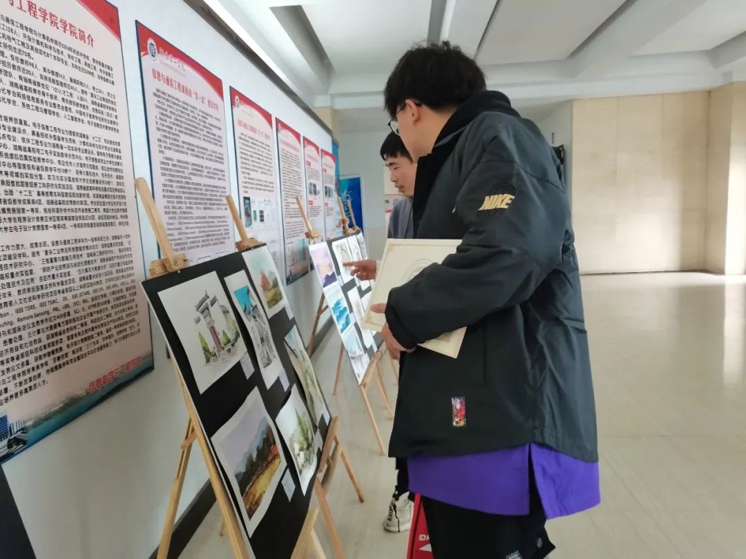 此次画展展出19建筑班写生作品,画展作品以速写和水彩画为主。19级建筑班学生为参展学生详细解释作品内涵及意义,并分享此次写生趣事。观展学生认真聆听,并表现出对写生的浓厚兴趣。罗家齐、黄钰清来到画展现场与学生共同观看画展,他们对学生绘画作品给予肯定,并希望学生再接再厉,增强专业技能。此次举办画展有利于提高学生艺术修养和绘画水平,同时也引导更多学生体会艺术之美,为绘画爱好者提供交流平台。