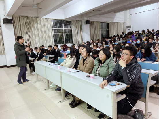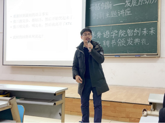 校园网讯 2020年12月11日晚,外语学院于7T1教室举办了“开拓创新——发展原动力”创新主题讲座暨外语学院智创未来团队聘书颁发典礼活动。本次活动由外语学院学生会学术科研部主办,院党委书记潘洞庭、副书记石红芳、团总支书记殷成韵以及学生会主席团成员陈祺和孙靖童作为嘉宾来到现场,杨稼辉博士担任本场讲座主讲人,外语学院学生参加。
