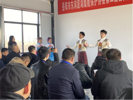 表演过后,蔡奕在岳阳市东洞庭湖麋鹿保护协会第二届会员大会暨换届选举大会上讲话,向大家宣传了我校洞庭渔歌志愿服务团队,并呼吁大家多多接触洞庭渔歌并将其传承下去。