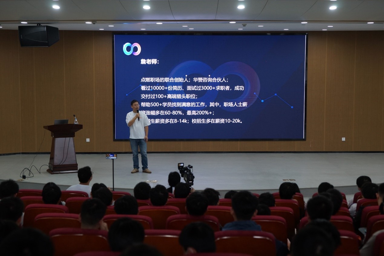 校园网讯 10月9日16:00,信息学院大学生就业指导讲座在17118举行,院党委副书记徐丹、李文彬老师及全体学工办老师出席,18、19级同学参加。讲座由点燃职场公司联合创始人詹泽军老师主讲。