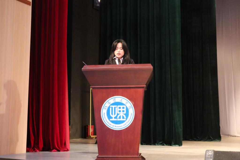 开学典礼在庄严的国歌声中拉开序幕。在学生代表发言的环节中,本科生新生代表赵雨晴同学表示,选择成为湖理人就要坚守理想,执着前行,号召大家从军训这一大学生活的起点出发,在大学里不断磨练自我,用饱满的热情去追梦圆梦。作为一名工作后再考研的同学,研究生新生代表李安琪建议新同学们时刻保持清醒的头脑,明确目标,自主创新,在自己所热爱的方向,开创出一片新的天地。经管学院学生会执行主席、老生代表于逸尘同学认为,只有学会学习、敢于尝试、勇于担当,才能在学校留下属于自己的青春足迹。
