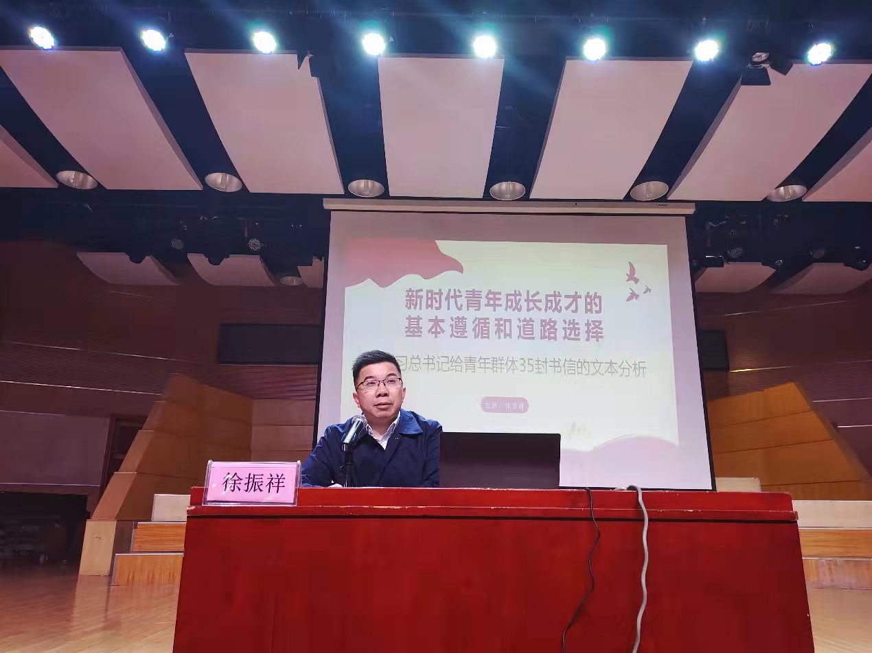 讲座开始,徐振祥以习近平总书记给青年群体35封书信为出发点,分别从逻辑起点、逻辑向度、逻辑进路三方面进行讲解。其中包括,一就35封书信的文本样态进行分析,包含对象群体、时间节点、主题内容的分析;二为同学们分析书信中为青年成长成才提供的六点基本遵循;三提到书信为新时代青年成长成才提供道路选择。同时结合真实案例,向同学们分享了当代大学生实际的学习生活状态,借用习近平总书记对青年大学生成长的期望勉励同学们,希望同学们牢记习近平总书记对青年大学生嘱托,自觉按照党和人民的要求锤炼自己、提高自己,向更优秀的同学学习。